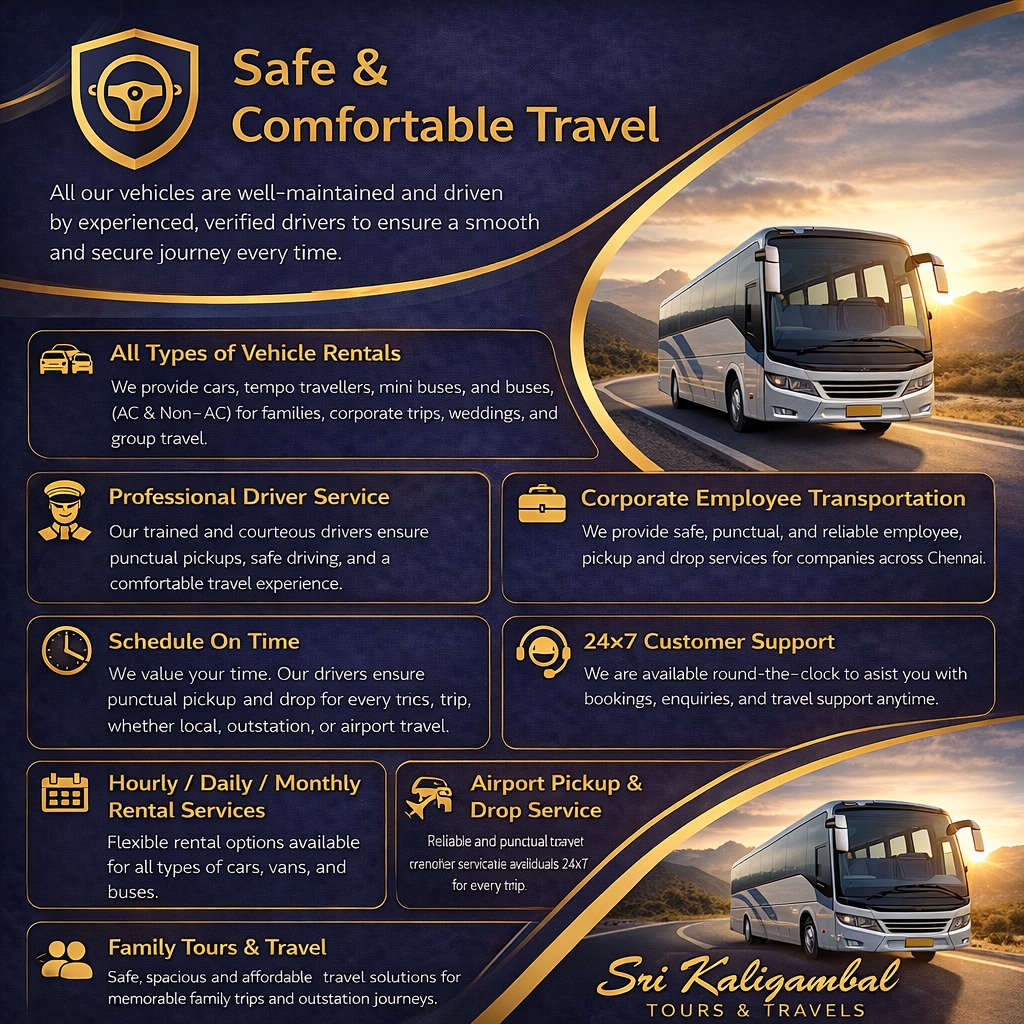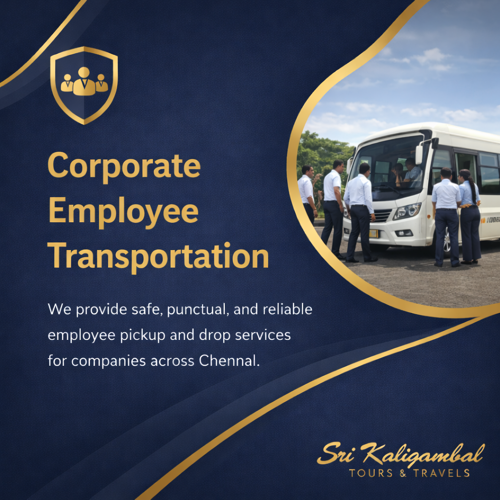 At Sri Kaligambal Tours & Travels (SKT), we provide reliable and punctual employee transportation services for companies across Chennai. Our structured route planning and shift-based scheduling ensure smooth daily pickup and drop for staff members..